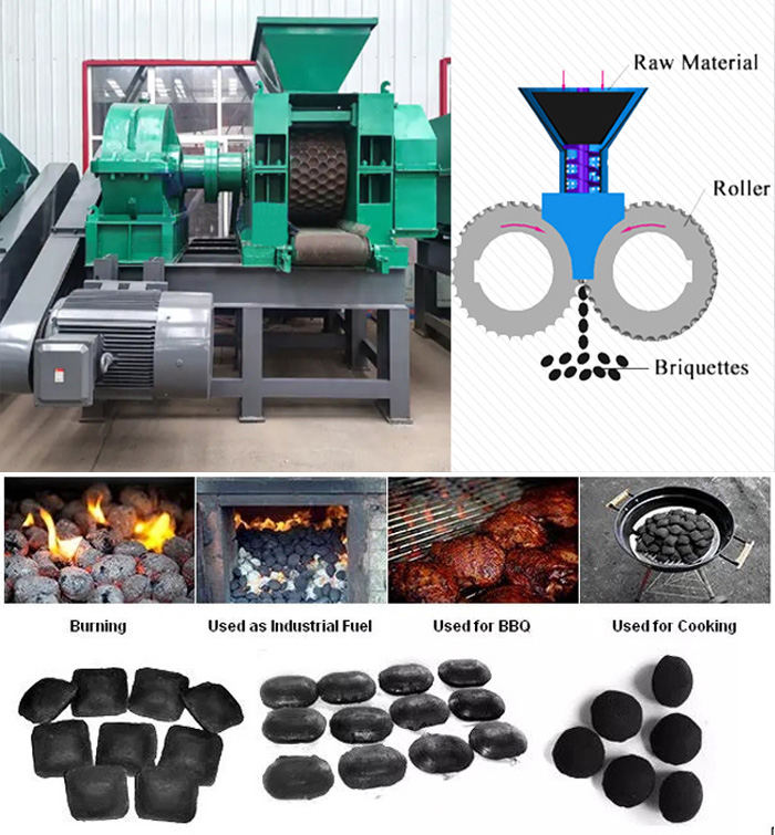 The formed charcoal briquettes are extremely useful in industrial and civil applications. For example, they can be used as industrial fuel for smelting, casting, etc. as well as BBQ, home fuel, home coking for heating.
